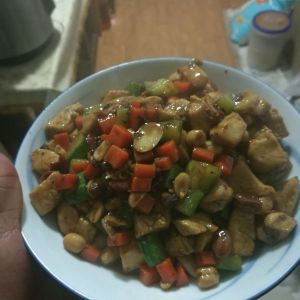 鸡脯肉切一厘米大小的丁加入胡椒粉、料酒、盐、干辣椒粉、淀粉,拌匀腌制20分钟左右后大火用植物油爆熟备用。有条件的话也可用微辣的烤鸡翅的成品腌料加淀粉腌制,这样肌肉味道更好。但是因为鸡脯肉,所以最好用一点淀粉,肉质会比较嫩。