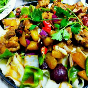 锅中鸡肉土豆熟透后将青椒,彩椒,元葱,葱花,蒜片,番茄酱一起倒入,加盐调味,翻炒均匀,倒在面上。