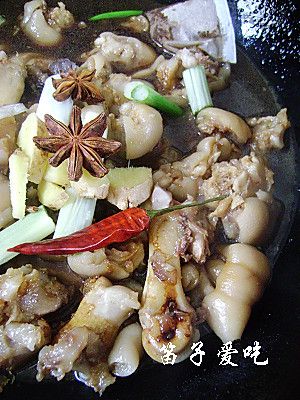 放猪蹄,加入八角、桂皮、葱段、姜块,翻炒均匀。倒入料酒、酱油和少许白糖,翻炒使猪蹄上色。加入和猪蹄持平的清水,烧开后,加盐调好味道,用小火烧至猪蹄软烂,用大火收至汤汁浓稠。