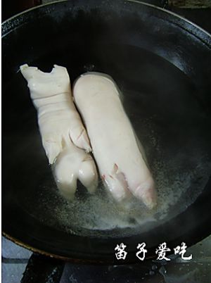 两个猪蹄(要保证干净无毛)入锅煮透,过冷水,控干水份,斩成小块