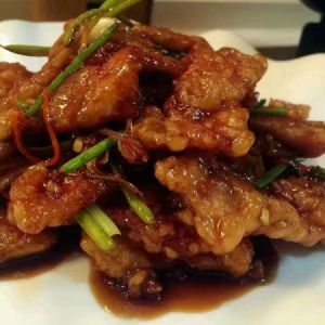 炒锅置火上,放入色拉油烧至六七成热,将肉片一片片展开,逐一下入锅中,炸至五六成熟捞出,开旺火复炸外酥内嫩时捞出沥油。