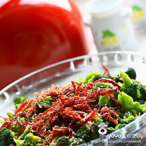 原料:西兰花400克、灯影牛肉丝300克、姜蒜各少量。