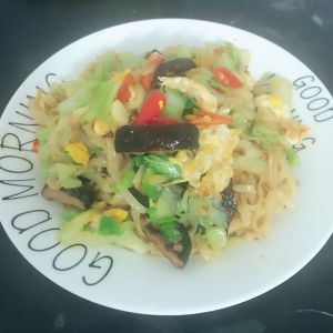 待卷心菜软了把面条下锅翻炒,怕炒不均匀的可以用筷子