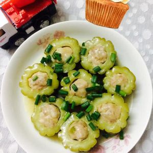 蒸好后的盘子里有汤汁,倒出来后,放炒锅里,煮开后加入水淀粉,盐酱油,搅拌均匀,开了后里面淋在苦瓜酿肉上