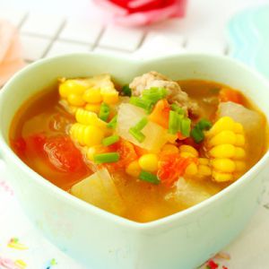 番茄去皮切小块,冬瓜切小块,玉米切小片