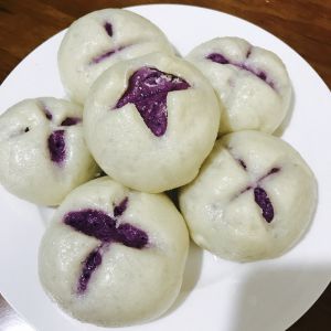 90g普通面粉+10g低筋面粉+2g酵母+紫薯泥(一定要晾至温热,太烫会烫坏酵母),加适量清水混合成紫色面团。