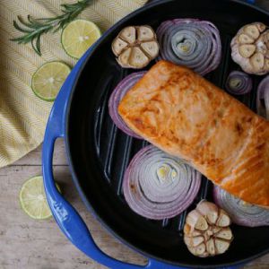 烤盘内放入洋葱大蒜,将煎过的鱼肉放在上面