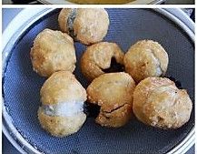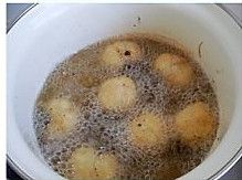 放入元宵炸至金黄,表面出现小泡泡时,就可以捞出控油,装盘。