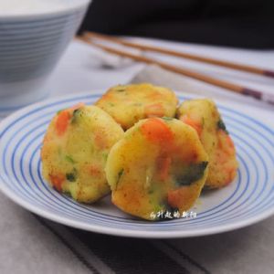 土豆用叉子压碎,胡萝卜切粒,和香肠、香菜、玉米粉、椒盐、盐一起拌匀。