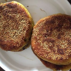 粘上芝麻,按成饼状,平底锅放底油,下锅小火煎至两面金黄