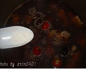 加半勺食盐,盖上高压锅的盖,大火煮十分钟,关火, 待到高压锅自然放冷,气栓掉下时开盖,
