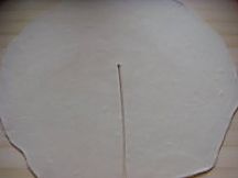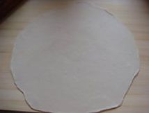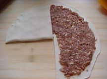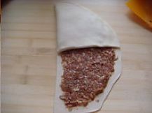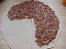 在面片3/4的地方铺上肉馅,注意留出边缘的位置。