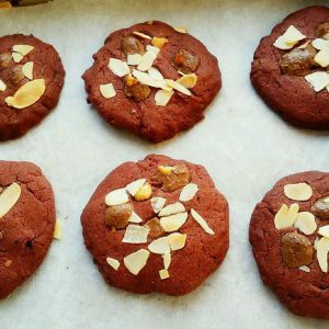 我比较喜欢大曲奇拿在手里的超级满足感,做的大块的,其实小的也可以,按上巧克力和杏仁片。(如果你够任性且无密集恐惧症,可以按满巧克力!)