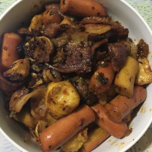 倒入底料锅内翻炒,加少许盐即可(因为懒得出门没有放蔬菜,如果你喜欢什么蔬菜就切好过水倒入一锅中翻炒即可)