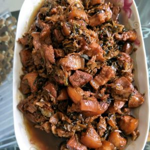 加足水 加入菜干 水开后转较小火慢炖,收汁,待汤汁被吸收后 ,便可起锅啦,可根据情况添加老抽或是白糖~
