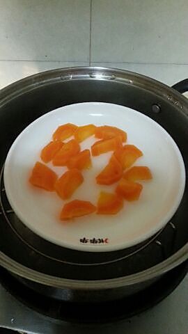 胡萝卜洗净,削皮,切小块,放盘入锅隔水蒸,约20分钟,蒸到用筷子可轻松地插穿萝卜,即可