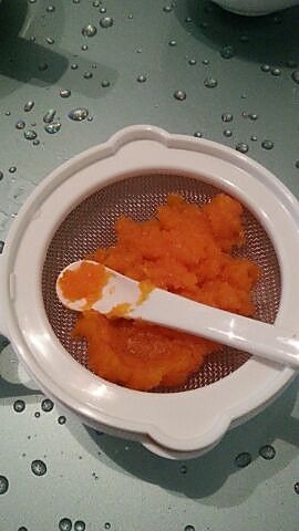 将压好的胡萝卜放入滤网,用硬勺挤压过滤