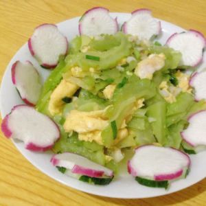 倒入油烧热,放入姜、蒜爆香倒入苦瓜翻炒1分钟加入鸡蛋。再次翻炒、沿着锅边烧点水等待1分钟 放入盐,味精撒入少许葱花起锅即可