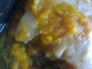 烤盘中用熔化的黄油均匀涂抹(不需要太多,切达芝士本身带有大量油脂),均匀的铺上一层胡萝卜南瓜泥(约一半的量),并码上鱼片。将余下的胡萝卜南瓜泥均匀的覆盖在鱼片上,保证完全盖住鱼片。最上面撒满切达芝士。