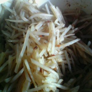 捞出放盆里后根据自己的口味放入辅料就可,美味的酸辣土豆丝做好了