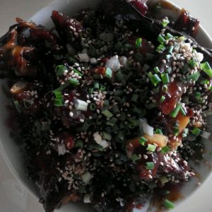 排骨七分熟时把事先弄好的糖醋汁倒入,直至收汁,撒上芝麻葱花