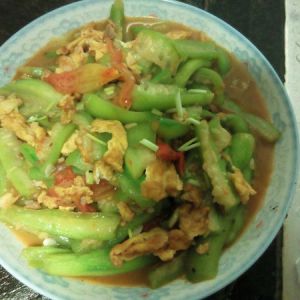 放油,放大蒜,炒丝瓜,然后放少许盐和蚝油,大火炒到丝瓜有些出水了,放西红柿在放些盐,炒一分钟后,放一点点水煮一分钟,放点鸡精,洒上葱花就可以出锅了