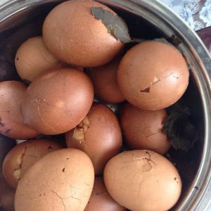鸡蛋煮到八分熟后捞出,用汤匙背将鸡蛋敲碎,水中放入盐,茶叶,十三香,鸡蛋放入继续煮