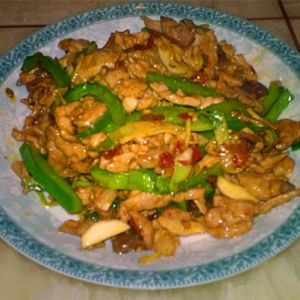 锅里放油,油温热后将青椒丝和肉丝一起倒入锅内,快速翻炒2分钟左右