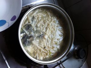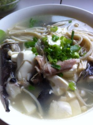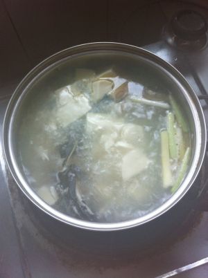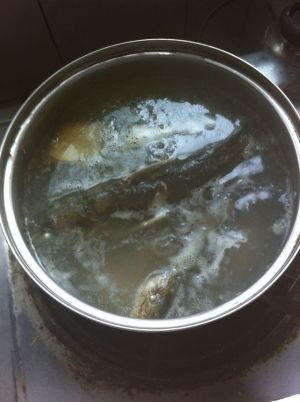 昂公鱼洗净油煎一下,放入汤锅放入姜片料酒,炖半个小时