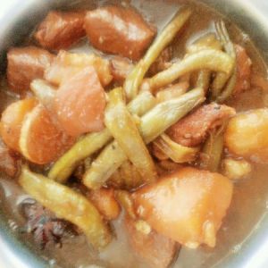 五花肉飞水,捞出控干。锅里放油,加热后,放入冰糖熬化放入五花肉翻炒。