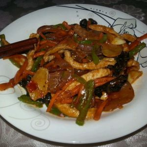 加入胡萝卜丝,木耳丝,尖椒丝翻炒两分钟,至胡萝卜目测变软(中火)