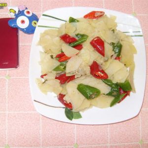 土豆片快熟的时候加入尖椒,翻炒至土豆片熟透,放入蒜末,出锅^^;