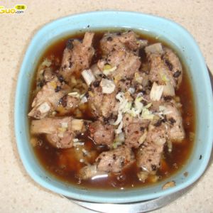 将葱姜蒜,豆豉切碎,锅中放少许油,炒香。放入排骨中,再加盐,糖,酒拌匀,腌制30分钟。