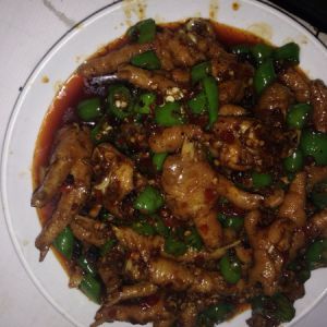 发现鸡爪有点破皮了就加尖椒,炒几下就加点味精拌匀就可以起锅了,注意尖椒下锅不要炒久了不然就没有清香味了。就这样香香的红烧鸡爪炒尖椒就完工啦!