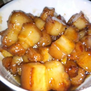 热锅放油一勺(不用太多,只要把糖溶化就行),两勺自糖炒变色起泡泡(注意很容易糊,快翻不要眨眼),把晾干水的五花肉入锅中翻炒,至肉两面都均匀的黄色,放姜片和蒜, 加两大碗水煮(我放的两大菜碗,一小时左右, 具体的看煮多久时间)。大火