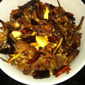 炒成金黄色,倒入刚刚炸好的鸡,继续抄
