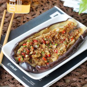 煮好的调味酱汁淋到蒸好的茄子上,尽量的铺满茄子周围