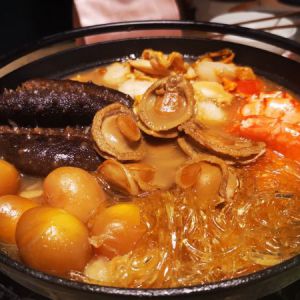 把金华火腿,花胶,干鲍和干贝碎(干贝留一部分煮透后再放)放入汤中,剩余用黄酒填补,放2颗枣和5颗枸杞,少许盐,水开后转最小火煲12个小时