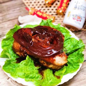 准备食材和工具:酱油心生50克、小鲜侣调味汁30克、肘子1块、姜片适量、干辣椒适量、花椒适量、八角适量、香叶适量、白寇适量、桂皮适量、6颗冰糖、1小勺盐、料酒100毫升、老抽适量、植物油适量、1碗水淀粉