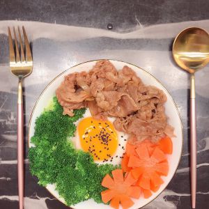 2、锅放油,炒洋葱丝、姜片、放入肥牛,两勺料酒、生抽、一勺蚝油、半勺白糖、蜂蜜、少许盐,水淀粉勾芡,一个溏心蛋。