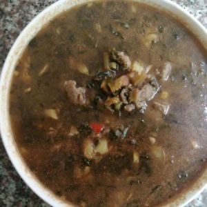 热油后加入糟菜小火炒香加入小米椒。开大火加入冷水直到烧开。