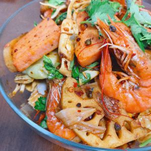 将蔬菜和豆制品按照易熟程度,先后炒制,再加入午餐肉片、海兔子翻炒,最后加入对虾翻炒;出锅前加入适量香菜点缀即可
