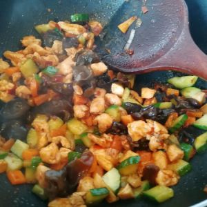 第五步:除了花生米,导入所有配菜,我准备了半根黄瓜、半根胡萝卜、一小把泡好的木耳,翻炒过程中加入少于盐和鸡精调味,导入生抽一勺,蒜末翻炒