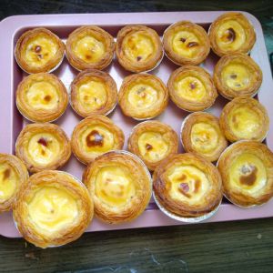 烤好的蛋挞塔皮酥脆,塔液嫩滑,又有蔓越莓干的酸甜口感。回味无穷。