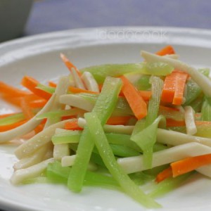 三、 锅中少许油,七成热放入杏鲍菇翻炒,稍变软,把莴笋丝、胡萝卜丝倒入大火翻炒至熟,加盐即可出锅。