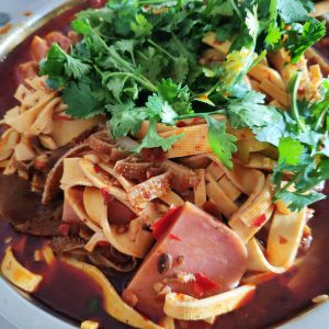 第二步 把毛肚和豆皮 午餐肉等切好,放入盆中备用,这个要和刚刚煮菜的盆分开,因为要单独煮。