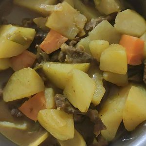 热锅凉油,下生姜片、葱段煸炒,炒出香味后,下牛肉炒至断生,下土豆块,略微翻炒后加水至没过土豆,中小火炖半个小时