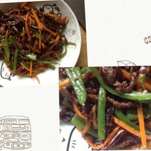加入胡萝卜丝和杭椒丝,放盐,蚝油,生抽,胡椒粉一起翻炒片刻。