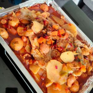 待鱼烤好后取出,将鱼移出托盘,把炒好的菜铺在托盘底部,再放上鱼,最后将汤汁洒在鱼身上。