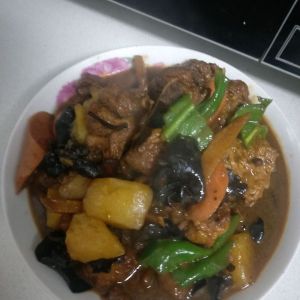 汤汁少一半放木耳土豆香肠(因为肉少放了点小酥肉,一块过年炸的豆泡,有面筋放面筋会很好吃)转中小火炖五到十分钟左右
